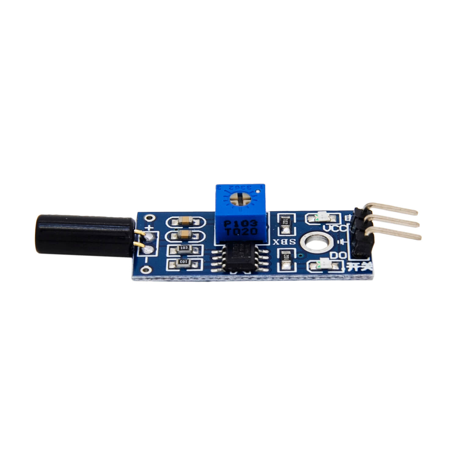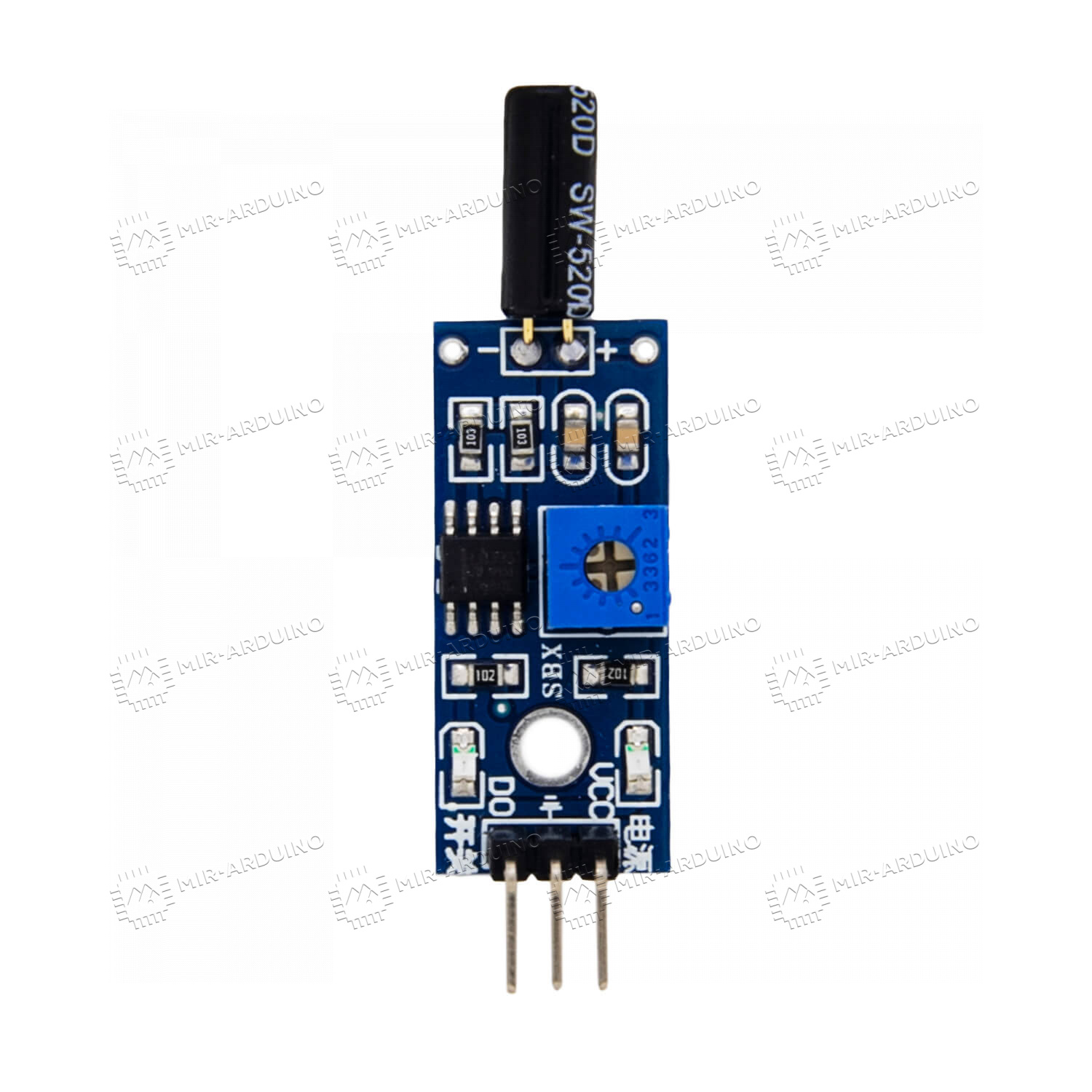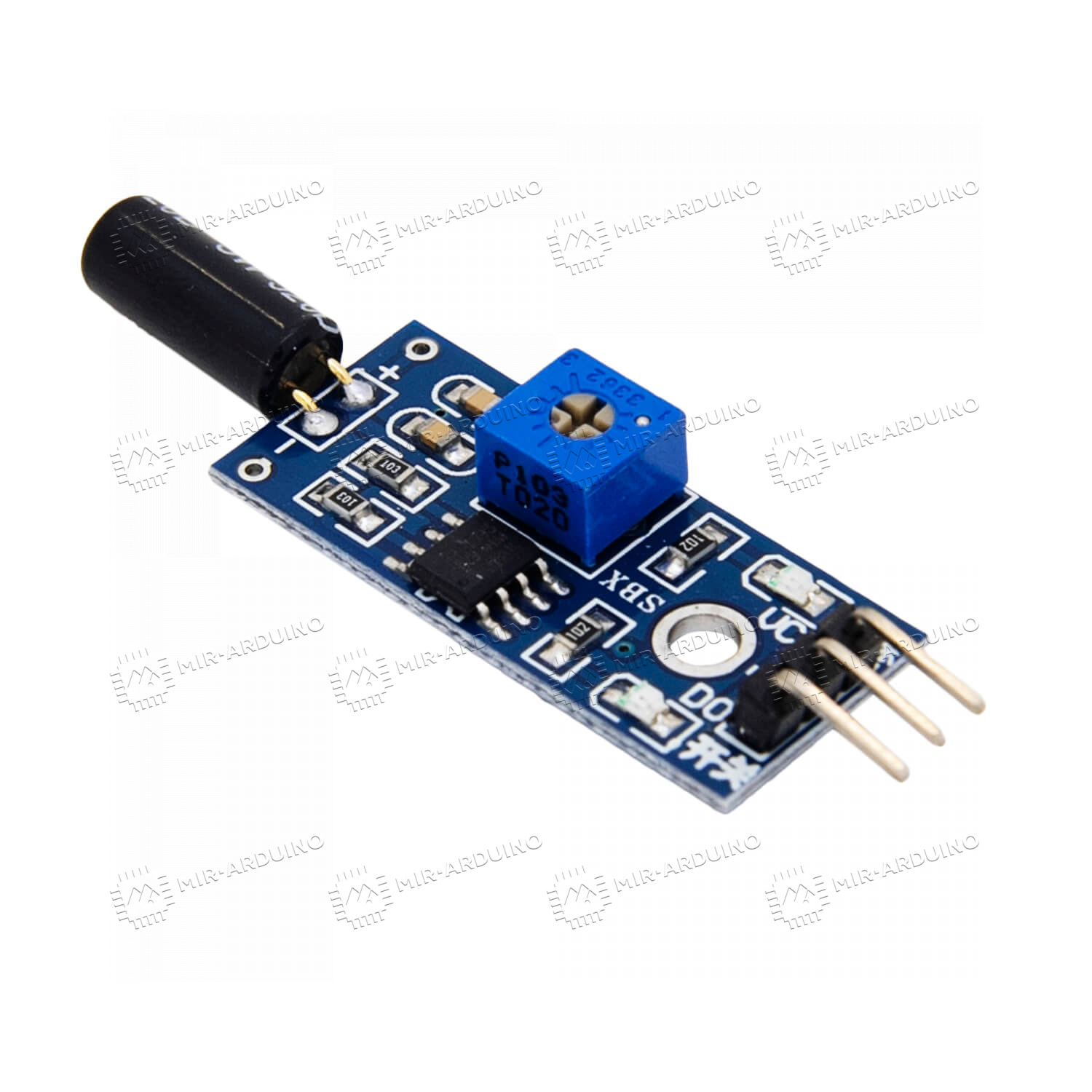Датчик вибрации (удара) SW-18010P предназначен для реализации проектов на базе Ардуино, связанных с сигнализацией и автоматикой. Сам датчик представляет собой пружину, которая помещена в металлический корпус. При ударных воздействиях пружина сжимается, касается корпуса, и это значение фиксируется. Модуль имеет 4 контакта – цифровой и аналоговый входы и два контакта для подключения питания. С помощью триммера на плате можно отрегулировать чувствительность датчика к разной степени воздействия. Работает от напряжения 3.3-5.5 В.